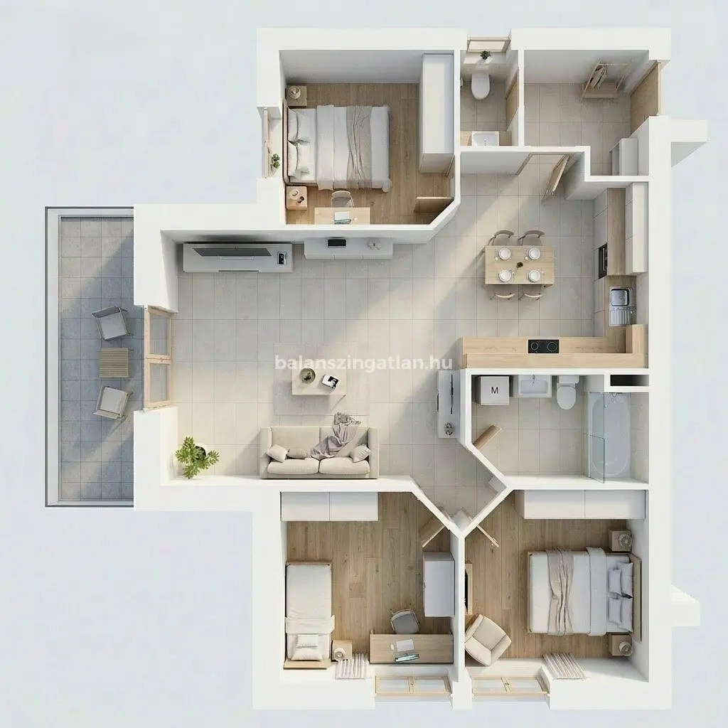 Élettér: Nappali, 3 szoba, előtér, konyha-étkező, WC, fürdőszoba+WC, erkély.